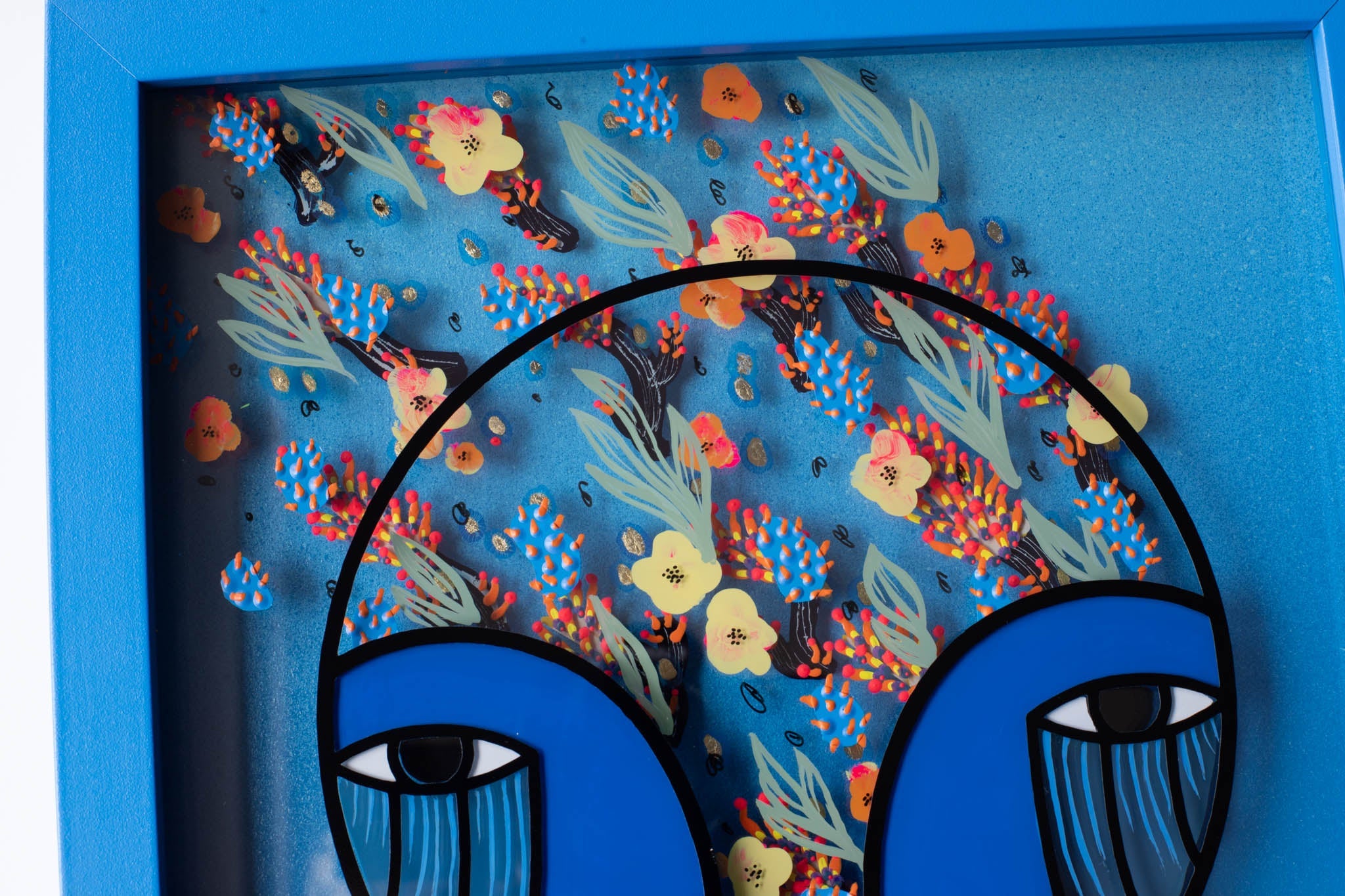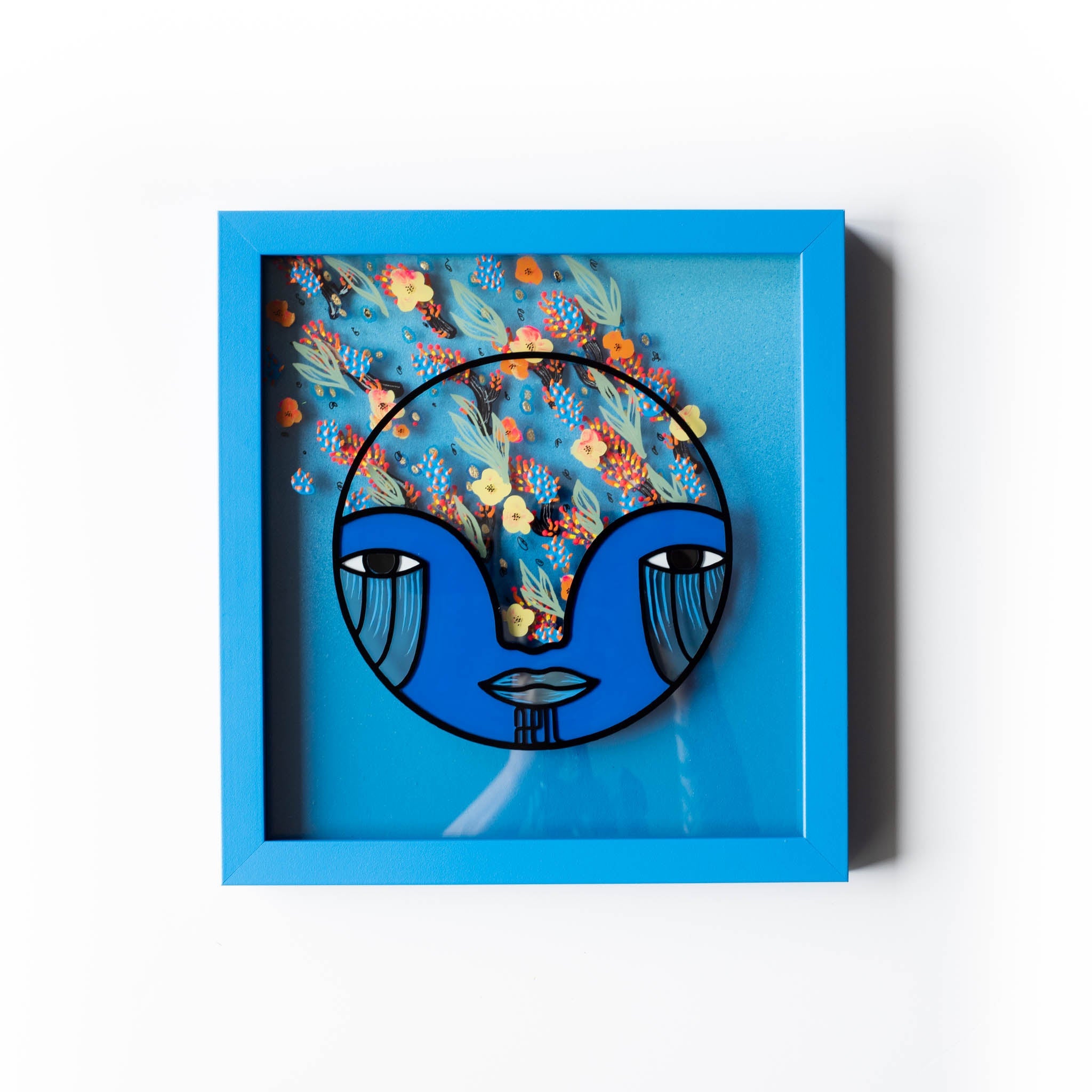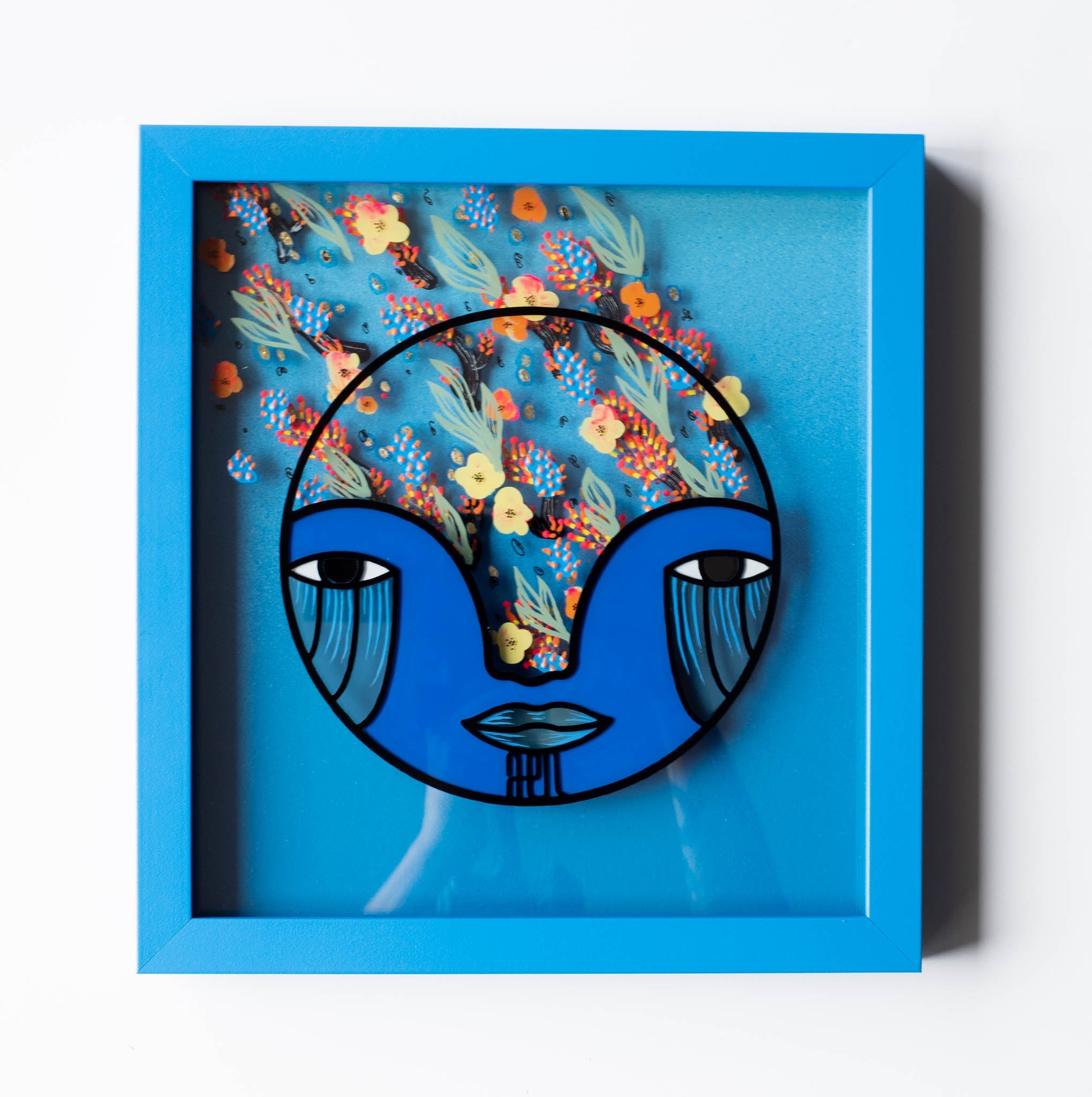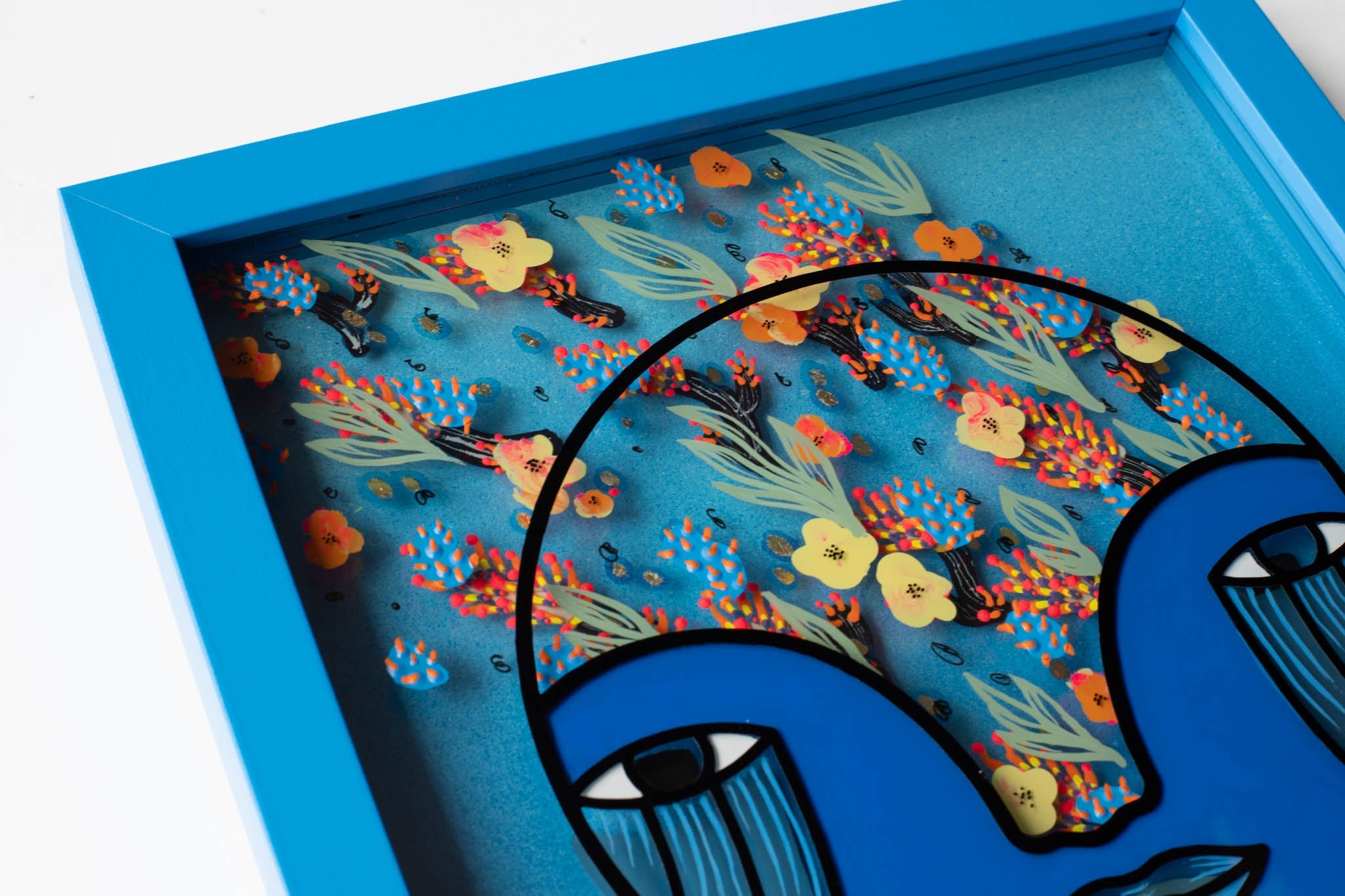 Jen Heads is a recurring motif by artist Jenna Ingram. The layered transparency of the glass panes creates both visual and metaphorical depth behind the mask-like face - stoic and unwavering in its gaze. The front layer of glass is painted on the back side of the face area, reinforcing the notion that while we may project an outward calm, the inner workings of the mind can be far more turbulent and complex.