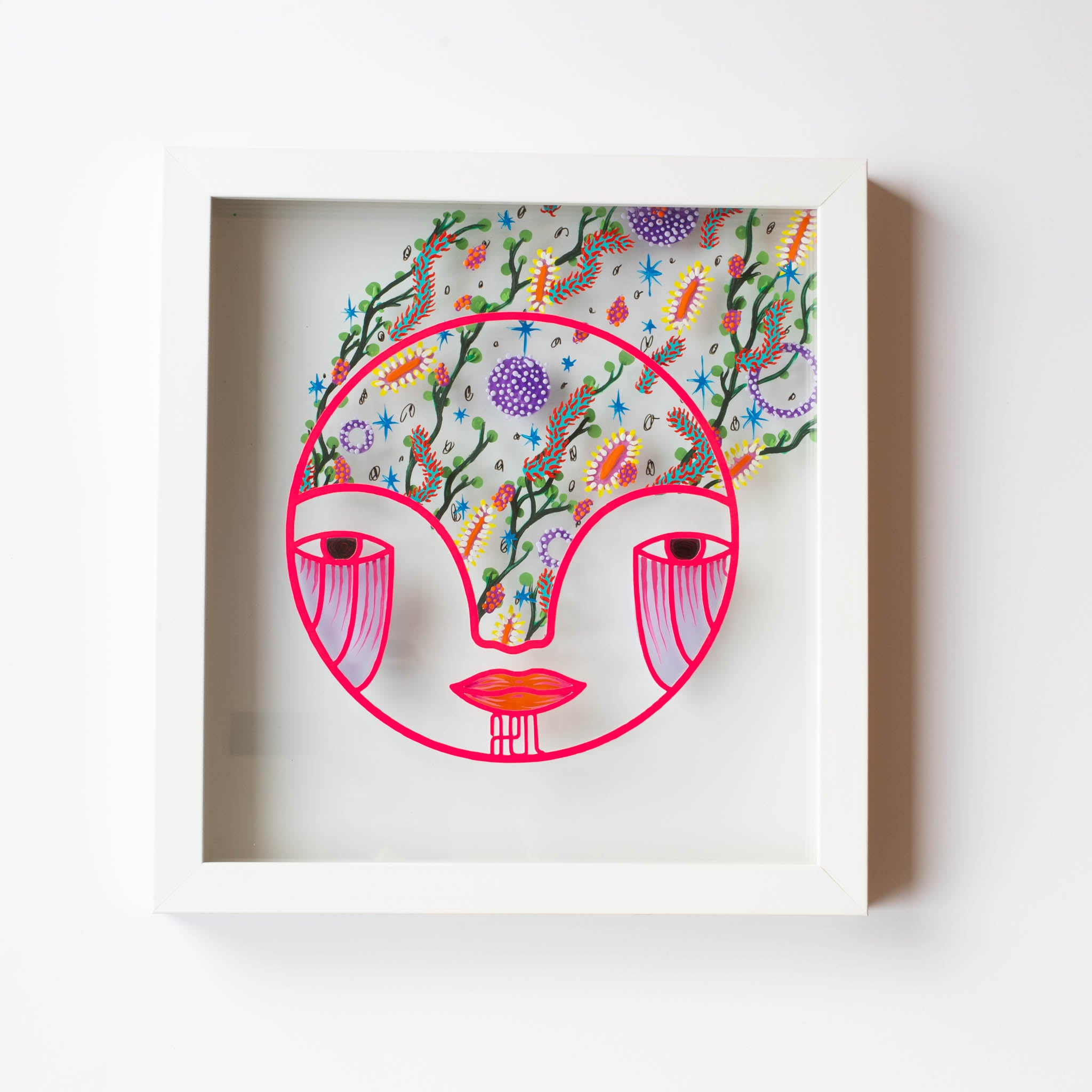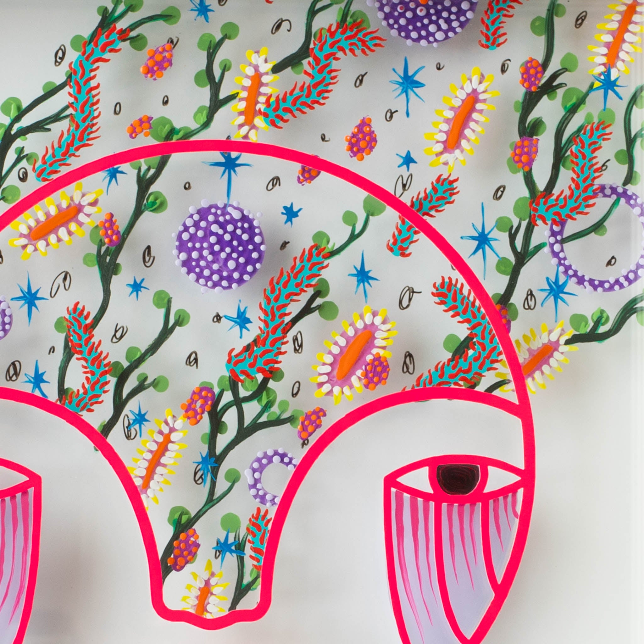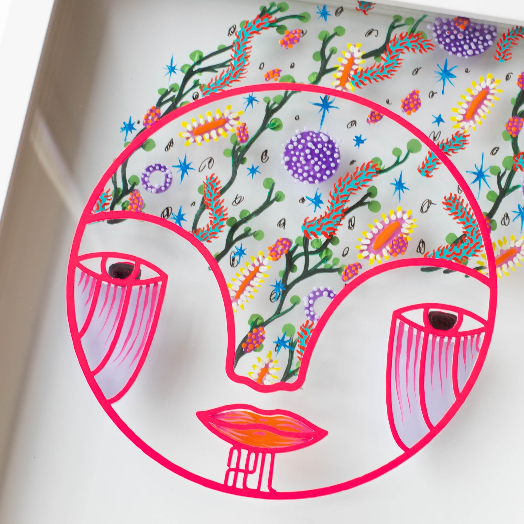 At the centre, the neon pink Jen Head stands stoic and strong, a nod to the feminine journey of endurance, reflection, and renewal. As in Jenna Ingram’s Glass Series 1.0, shapes and symbols drift from within and around the head, expressing the flow of consciousness and the unseen forces that shape our inner worlds.