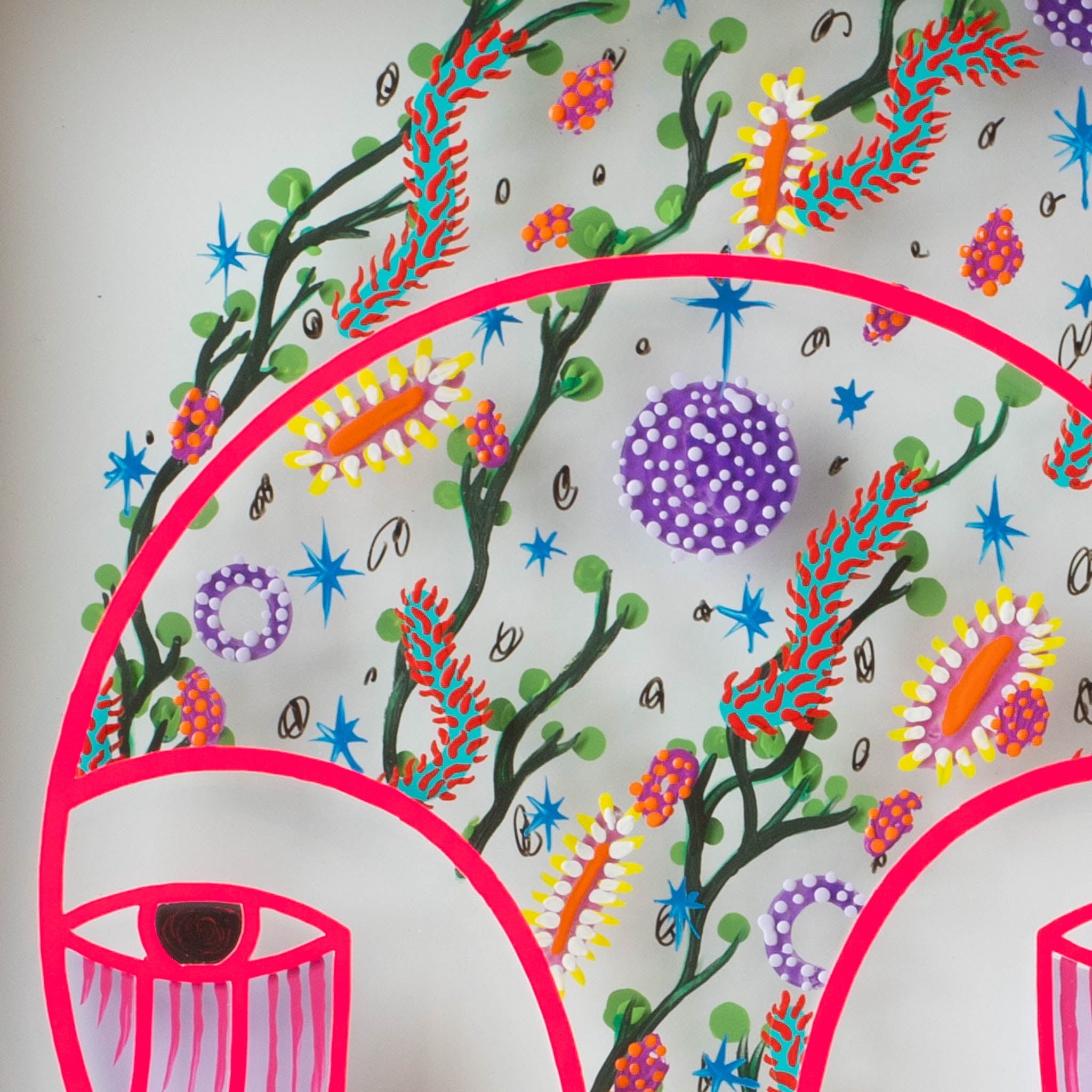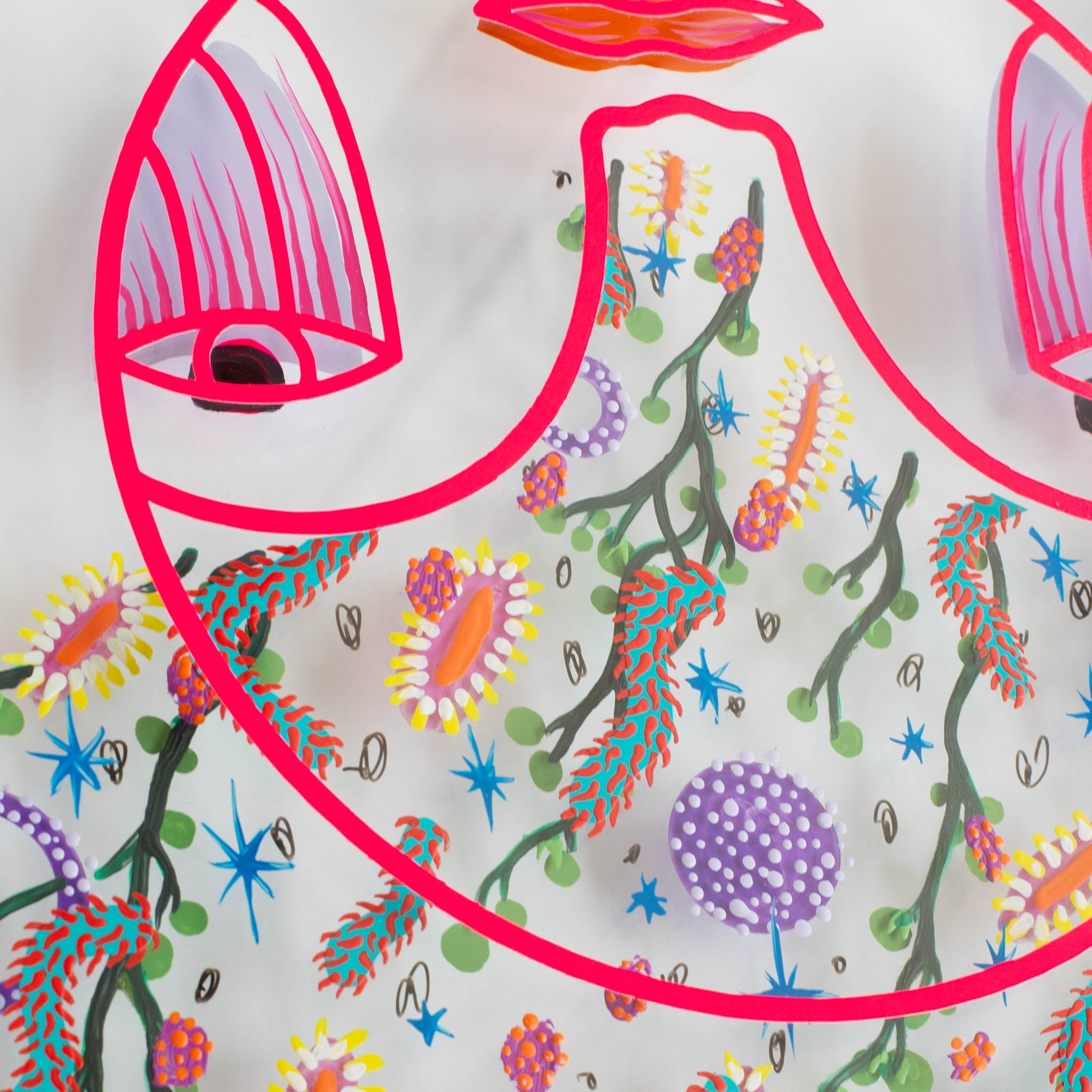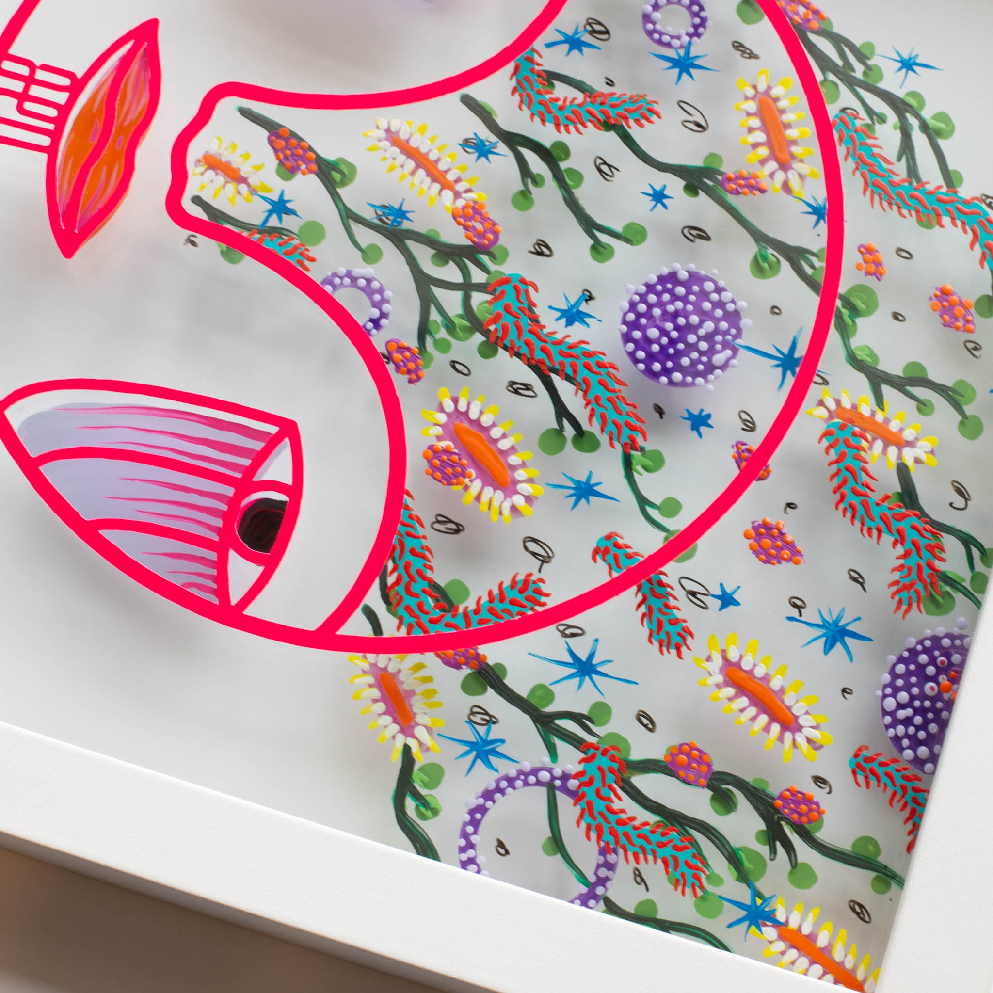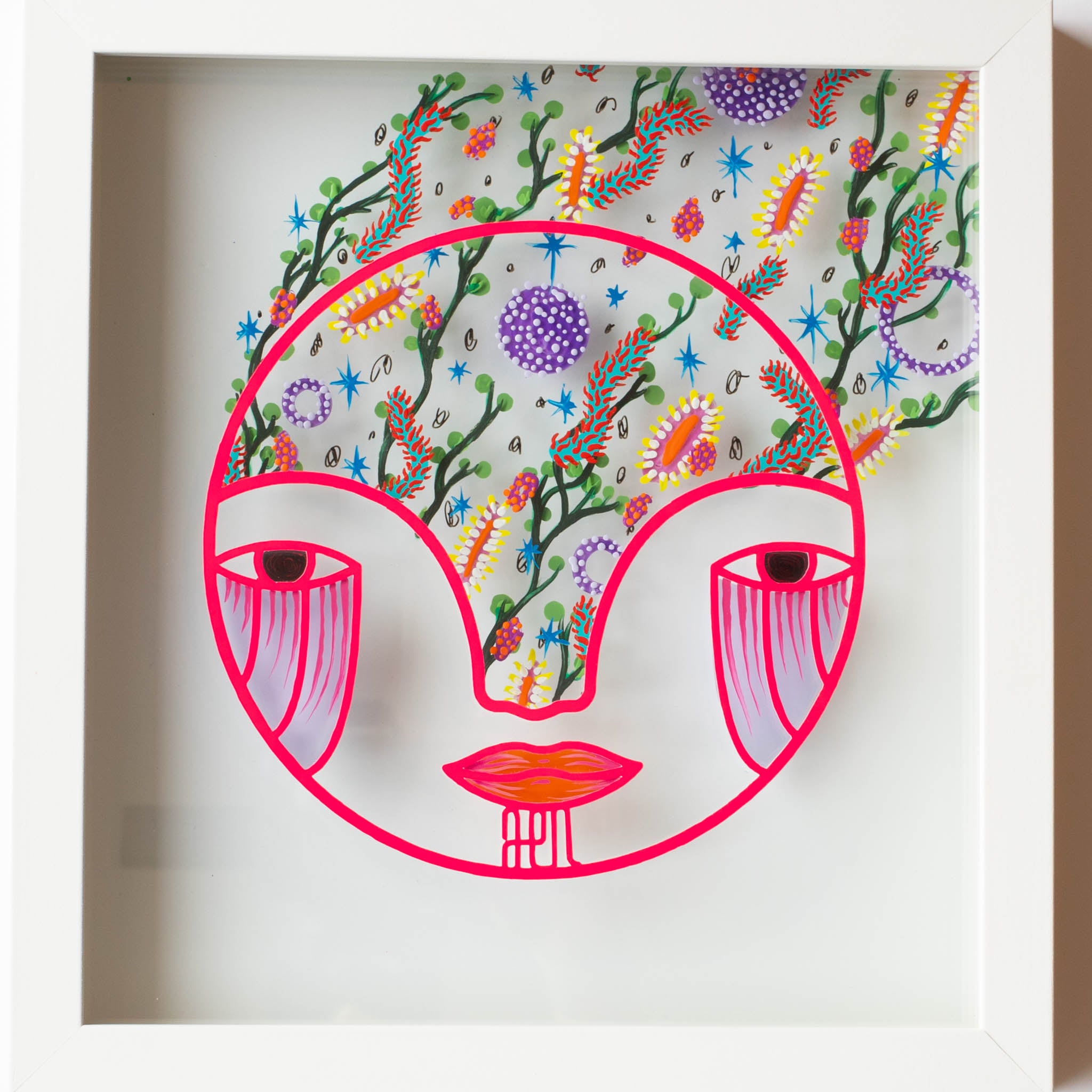 At the centre, the neon pink Jen Head stands stoic and strong, a nod to the feminine journey of endurance, reflection, and renewal. As in Jenna Ingram’s Glass Series 1.0, shapes and symbols drift from within and around the head, expressing the flow of consciousness and the unseen forces that shape our inner worlds.