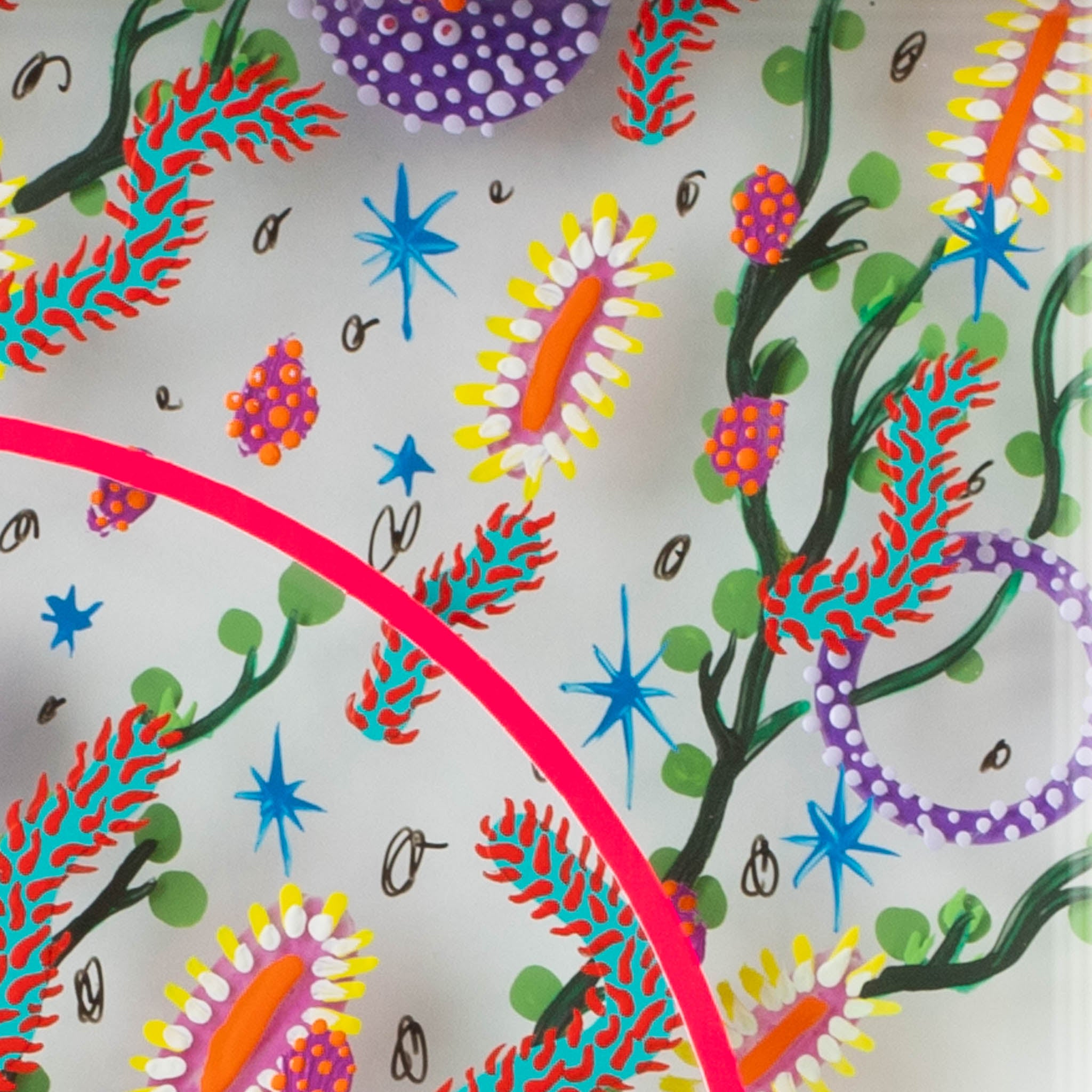 About the Artwork: Inner Growth is a vivid exploration of transformation from within. Through layers of colour, form, and transparency, the work reflects the many ways growth manifests: cellular, cosmic, and emotional. Floating abstract shapes suggest life at its smallest scale, while divine star-like forms and organic, linear growth patterns speak to nature’s slow, evolving rhythm. Unexpected, spiked elements interrupt this flow, symbolising the moments of disruption that, though challenging, often become catalysts for deeper transformation.